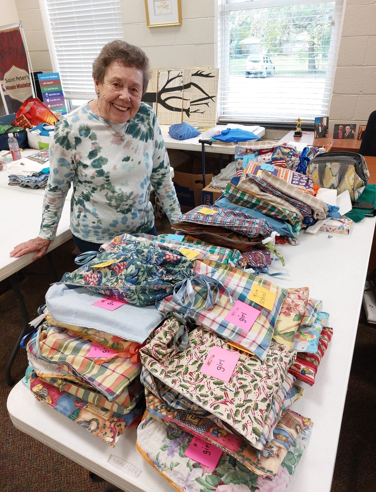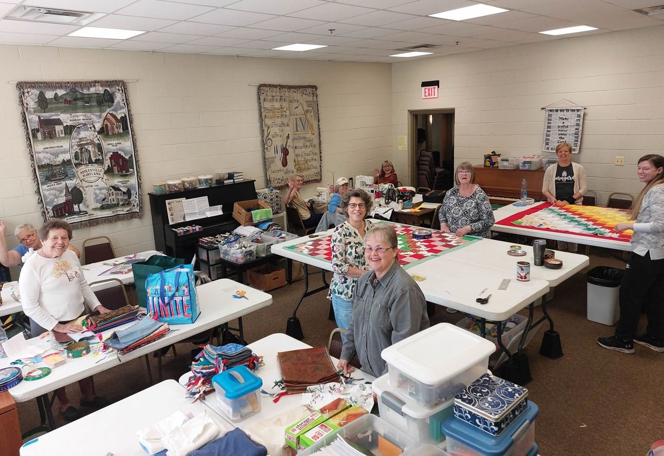 Truth and Hope Outreach is an all-volunteer group which gathers on 1st and 3rd Tuesdays to make outreach-targeted gifts together. We spend our work days assembling comforters, sewing baby items, filling gift bags, cutting, pinning, and visiting with each other.